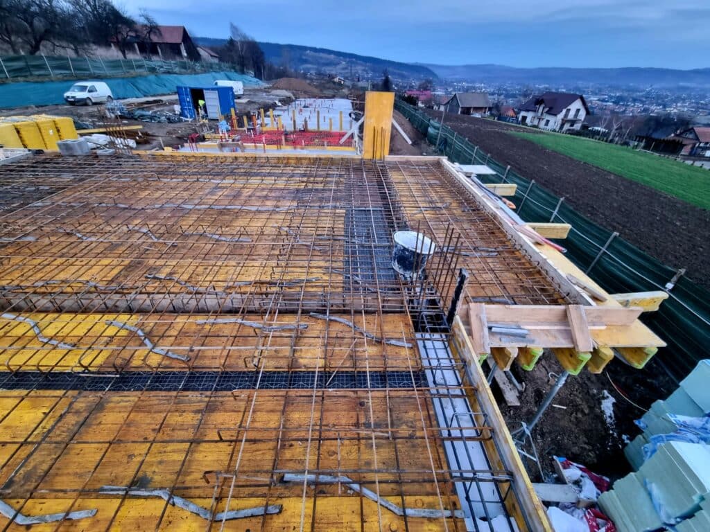 Monolityczna płyta fundamentowa o imponującej grubości 30 cm, wykonana z wysokiej jakości betonu B30-W8, obejmuje całą powierzchnię budynku, ...